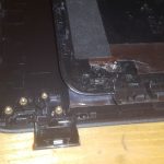 - palmrest – czyli górna część obudowy, na której jest montowana klawiatura. Tutaj były urwane dwa gniazda śrub i możliwe, że przez to wcześniejsza naprawa była niekompletna i siła przykładana przy otwieraniu obudowy rozrywała konstrukcję.