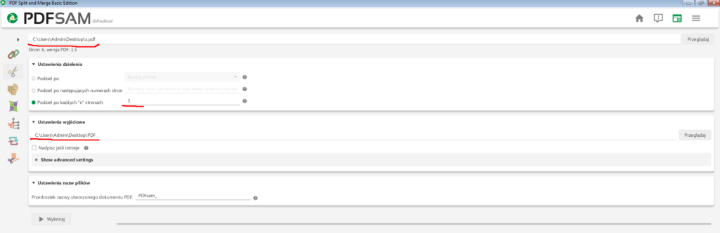 Należy wybrać funkcję Podziel aby rozbić jeden duży plik na wiele mniejszych. W tym celu wczytujemy nasz duży plik, zaznaczamy Podziel po każdych „n” stronach i wpisujemy tam 3. Należy jeszcze zdefiniować folder, w którym zostaną zapisane nowe mniejsze pliki. Zdecydowanie nie polecam używać do tego pulpitu. Pokażę operację na przykładzie pliku, w którym jest tylko numeracja dokumentów i stron. Pierwsza liczba oznacza dokument, a druga stronę w danym dokumencie.
