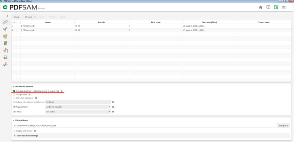 Teraz należy tylko połączyć wszystkie pliki ponownie w jeden duży plik z uzupełnieniem o dodatkowe puste strony. W PDFsam należy przejść do funkcji Połącz. Po jej wybraniu ukaże się okno, do którego można dodać pliki, które mają się połączyć w jeden duży dokument. Koniecznie należy zaznaczyć opcję Dodaj pustą stronę, jeśli liczba stron jest nieparzysta. Na końcu pozostaje wybranie gdzie plik ma zostać zapisany.