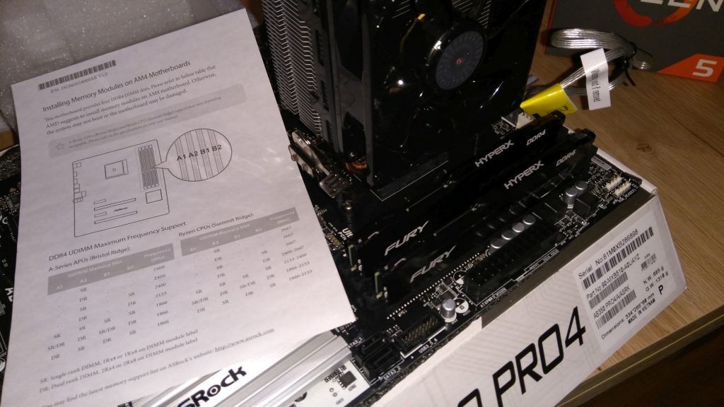Budżet pozwolił na wsadzenie 8 GB pamięci RAM DDR4. Wybór padł na HyperX Fury Black w dwóch kościach po 4 GB, o częstotliwości 2666 MHz oraz opóźnieniu CL15. Specjalnie kości w zestawie żeby działały w trybie dual channel. Zresztą widać, że sprawdzałem w które gniazda powinny być podłączone żeby działały w dualu.