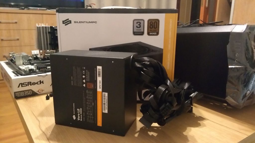 Do zestawu wszedł zasilacz SilentiumPC Vero L2 500W z certyfikatem 80 PLUS BRONZE. Właśnie posiadanie certyfikatu minimum brązowego było przeze mnie wymagane, bo inaczej klauzula sumienia nie pozwoliłaby mi na montaż.