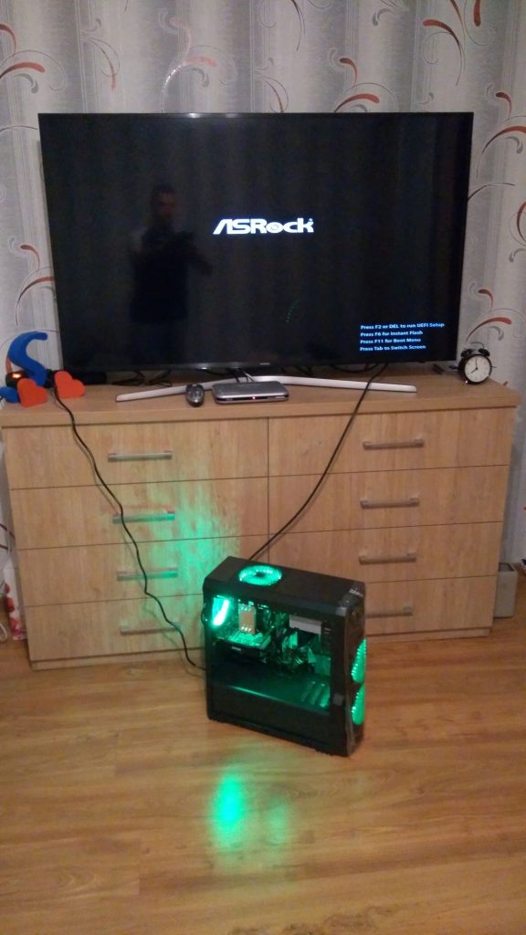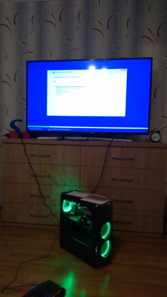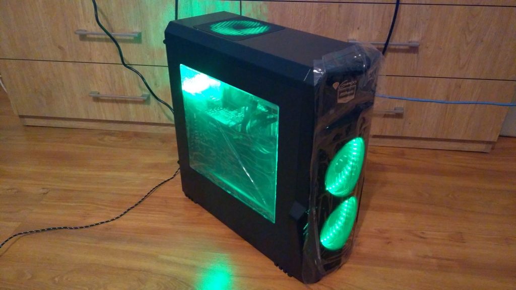 Zacznę od obudowy. Nie miała być zbyt droga, a miała świecić, więc świeci. Model obudowy to Natec Genesis Titan 800. Włączony komputer w tej obudowie prezentuje się następująco: