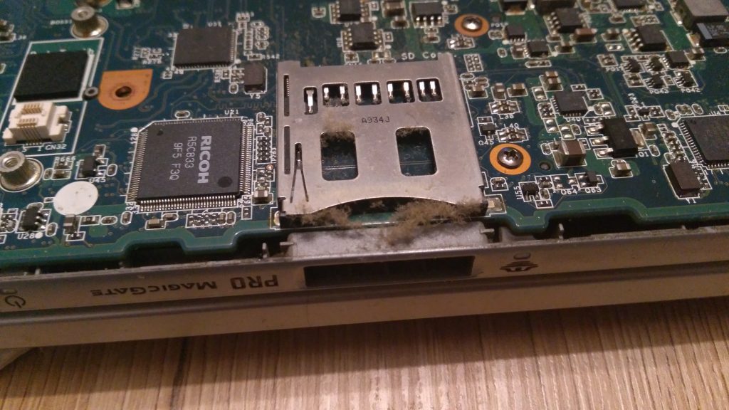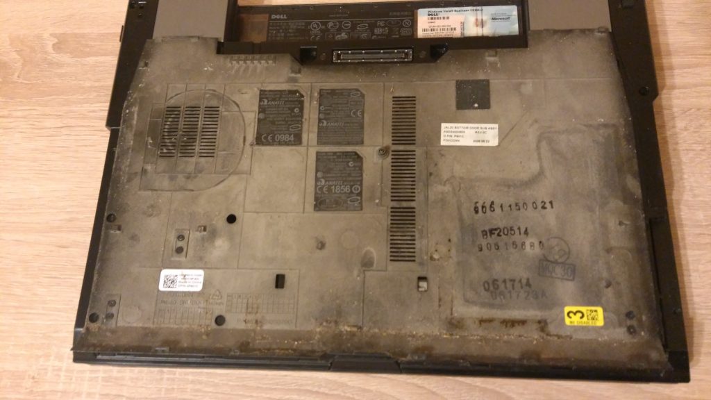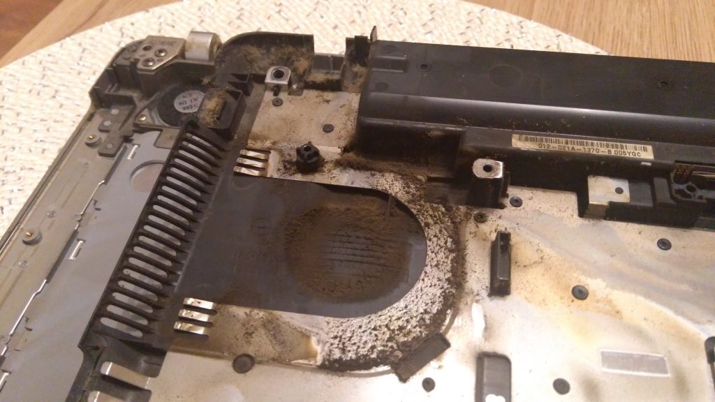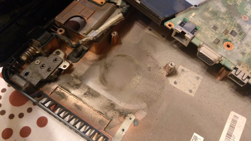Jak widać konserwacja chłodzenia była konieczna. Co do samego brudu, to laptop się miejscami kleił, podejrzewam, że był zalany. Ciężko było zdjąć dolną klapę, a jest ona trzymana tylko jedną śrubą i się wysuwa. Tu było trzeba podważyć, bo się kleiła. Oto jeszcze kilka fotek z tego laptopa.