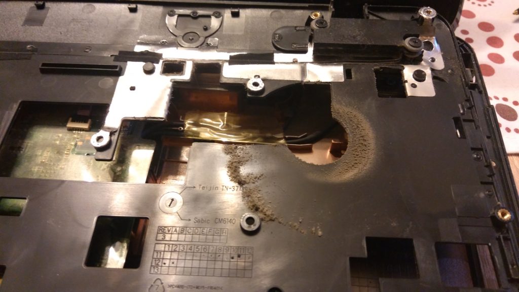 Po obejrzeniu laptopa okazało się, że obudowa jest mocno zniszczona. Dotyczy to dołu (kadłubka) jak i góry (palmrestu). Palmrest był wcześniej naprawiany, a świadczą o tym liczne klejenia widoczne na zdjęciach: