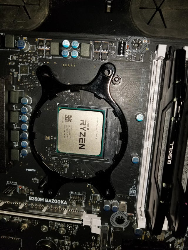 Jak widać nie ma zabezpieczenia od góry, a zabezpieczenie, które jest, to prowizorka. Przy zdejmowaniu chłodzenia może dojść do wyjęcia chłodzenia razem z procesorem. Niestety dzieje się to zwykle tak, że procesor wychodzi krzywo i ma pogięte piny. Straszny błąd konstrukcyjny AMD.
